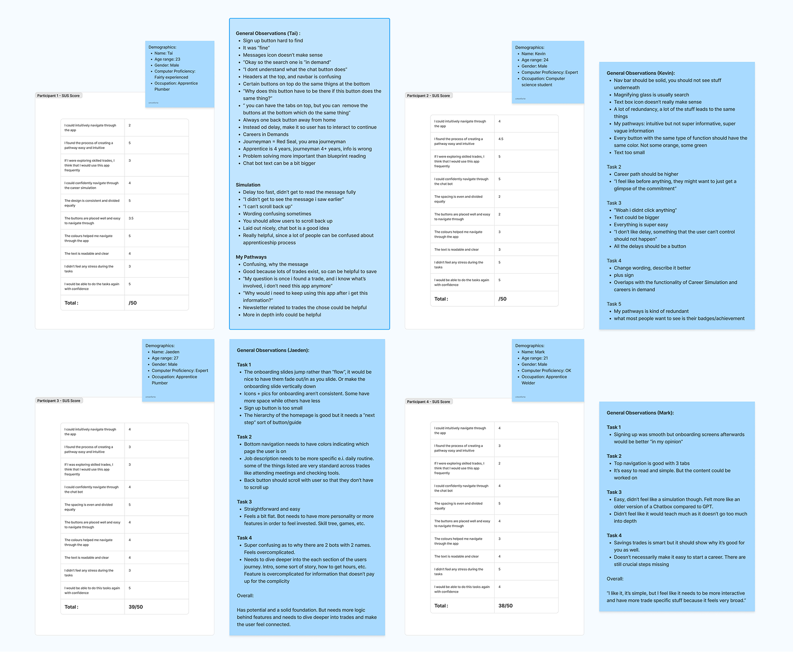 We conducted usability testing on our prototype across five tasks and received an average SUS score of 38.75 out of 50.